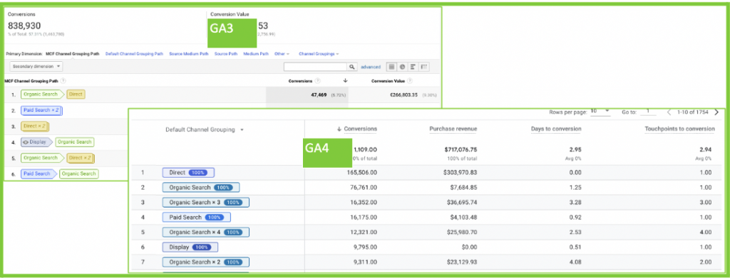 Conversion paths reports can be used to understand your customers’ paths to conversion, meaning you are no longer focused on last-click paths but understanding how different channels need to work in conjunction with each other to drive ultimate value. In Universal Analytics, these reports were called Multi-Channel Funnel reports, in GA4 they are Conversion Path reports: