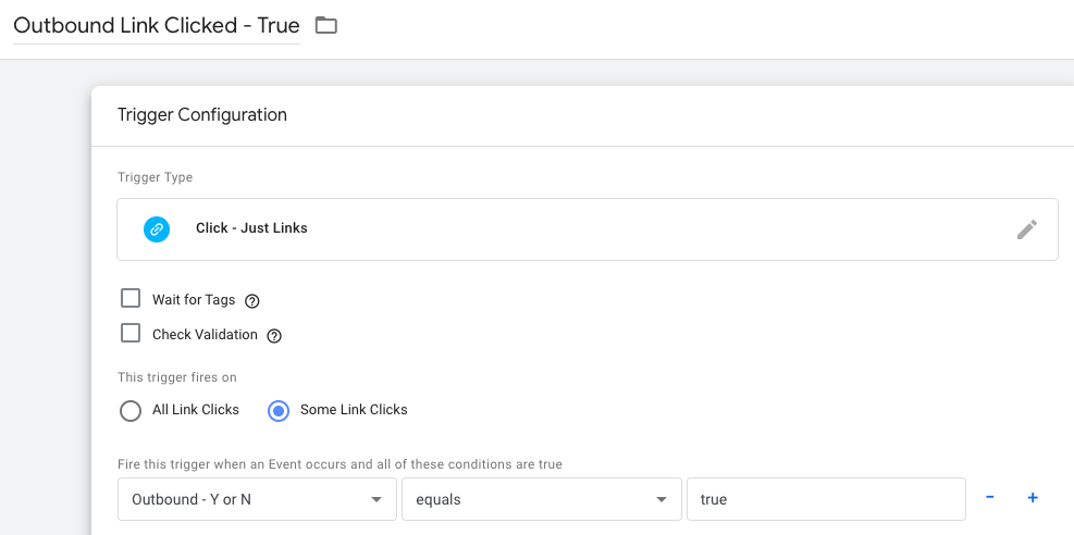 This in turn means that if we want to set up a tag to track Outbound Link clicks, we would simply need to configure our trigger as per below:-