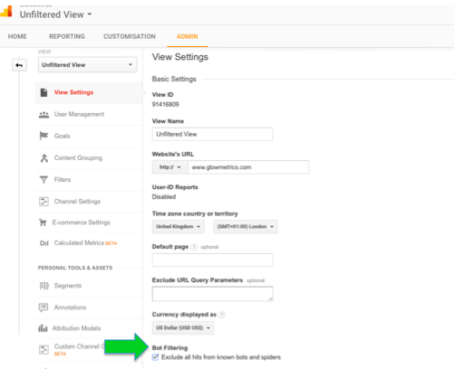 The last stat I read found that bot traffic can now make up, up to 60% of traffic to a website. 6% is crazy, 60% is unbelievable! If you’ve ever looked at your referral traffic and found traffic from unfamiliar locations with a time on site of seconds, 1 page per visit and high bounce rate you can normally define this as bot traffic or non-human traffic. Thankfully Google have recognised this and under ADMIN – VIEW and VIEW SETTINGS you can now simply tick a box to ‘Exclude all known bots and spiders’: