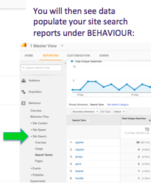 What does this mean? Setting this up allows you to see a range of new reports in the SITE SEARCH reports (under BEHAVIOUR) for example, what people searched for, from what page they searched from, % search exits, search terms used and lots more!