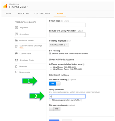 For example, in the case of GlowMetrics, when you perform a search you will see an s before the search term each time so this is our query parameter that Google can now use to identify that a search has been performed: