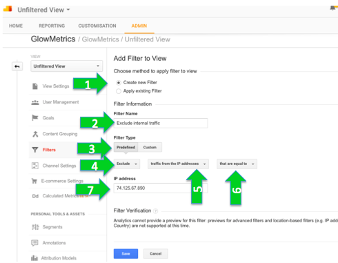 To filter out internal traffic, click on FILTERS (just under VIEW SETTINGS), click to create a new filter (1) add your filter name (2) select a predefined filter (3) and select exclude (4) traffic from the IP addresses (5) that are equal to (6) and pop in your IP address (7):