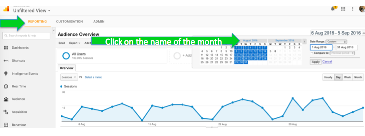 Tip 4 is a relatively easy one! Have you ever opened up Google Analytics and wanted to view your report stats for the last month/ current month/ any month?! Did you know that instead of individually selecting the dates of the month you can just select the month title and it will automatically select all dates within that full month for you? It’s a small tip and will save you a few seconds every time you use it but I use it multiple times every day so by the end of the week I’ll have saved minutes.