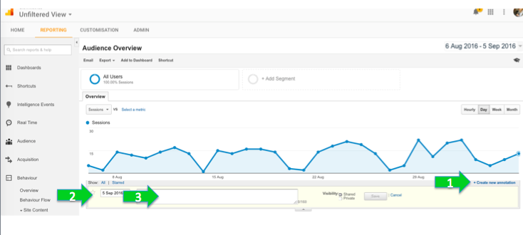 Annotations act as small notes on your account, to remind you of what happened that day, so when you look back on data and see a big spike or dip in traffic, you don’t have to spend hours trying to remember what caused this.